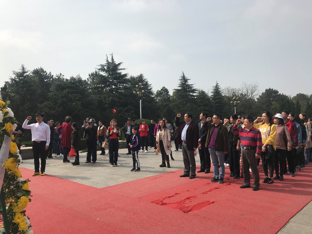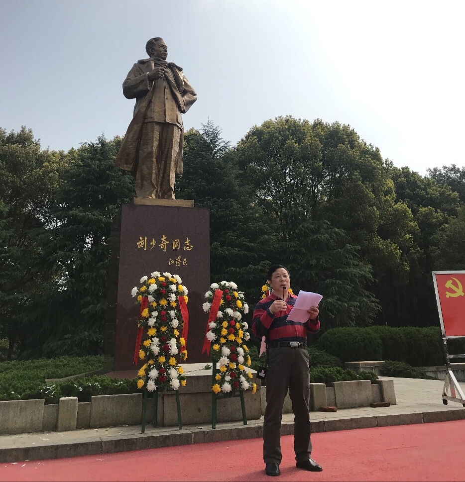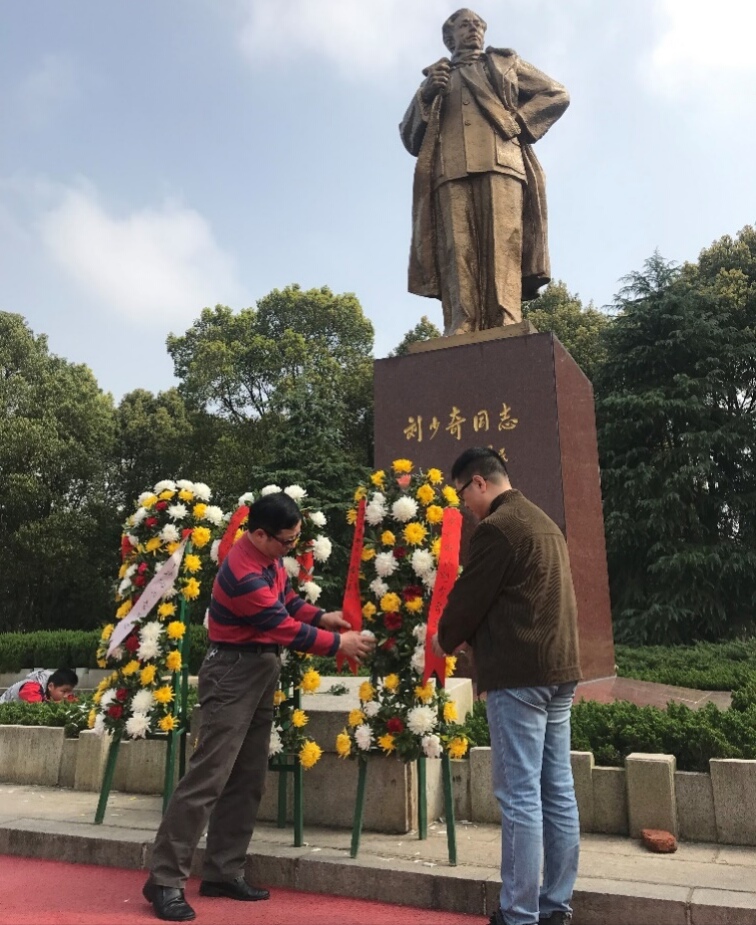 上午8点30分,云开雾散,旭日东升,公司全体教职工党员和部分教职工代表怀着无比崇敬的心情,集体乘车从公司出发,于上午10时许抵达刘少奇故里。参加本次活动的教工党员和教职工列队向刘少奇铜像敬献了花篮,公司党委书记胡建国、经理彭祝斌整理了花篮缎带。接下来,全体教工党员肃立刘少奇铜像前,向伟人三鞠躬,表达缅怀之情,并庄严高举右手,面向党旗重温了入党誓词。