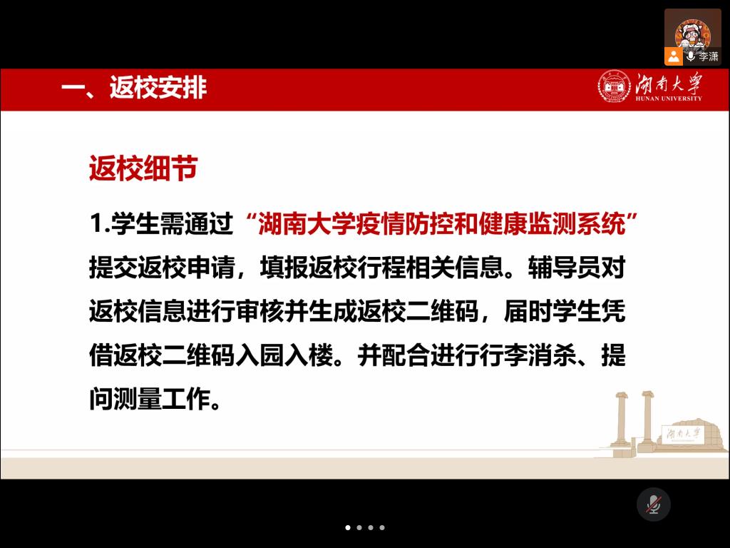 会上,李潇老师详细讲解了寒假返校的流程安排。李潇老师强调在疫情防控常态化的背景下,研究生一定要遵守研究生返校刘畅,同时她也督促各位研究生干部,尤其是班级干部,一定要通知到位、确保回复。