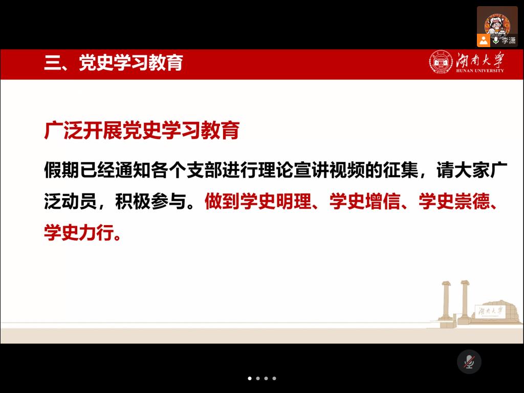 此外,李潇老师还结合建党百年的重要时间节点以及党史学习教育的契机,对研究生骨干如何发挥先锋作用,带头做到“学史明理、学史增信、学史崇德、学史力行”进行了指导。她提出,研究骨干要守住初心同时善于创新,让传统的思政教育变得更加鲜活。