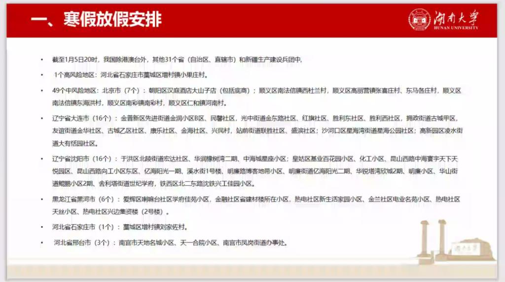 会议中,伍老师表示,为了保障员工安全,且考虑到近期各地疫情反弹情况,目前家乡为中高风险地区的同学可以不急于回家,学工部已在制订更为详尽的工作方案,有关寒假的具体安排一旦有所调整,公司会第一时间下达通知,望同学们稍安勿躁;