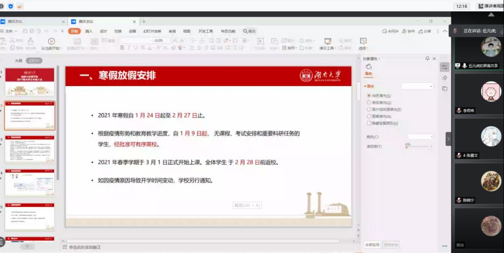 会议伊始,伍老师向同学们详细介绍了公司关于寒假放假的通知要求。公司于5日下发的《关于做好2021年寒假期间有关工作的通知》显示,2021年寒假放假时间为1月24日至2月27日,员工返校时间为2月28日前,2021春季学期开始时间为3月1日。就通知内容,伍老师着重强调,自1月9日起没有课程及考试安排的同学,可在学工系统填写离校申请,待公司审批下来后即可离校。