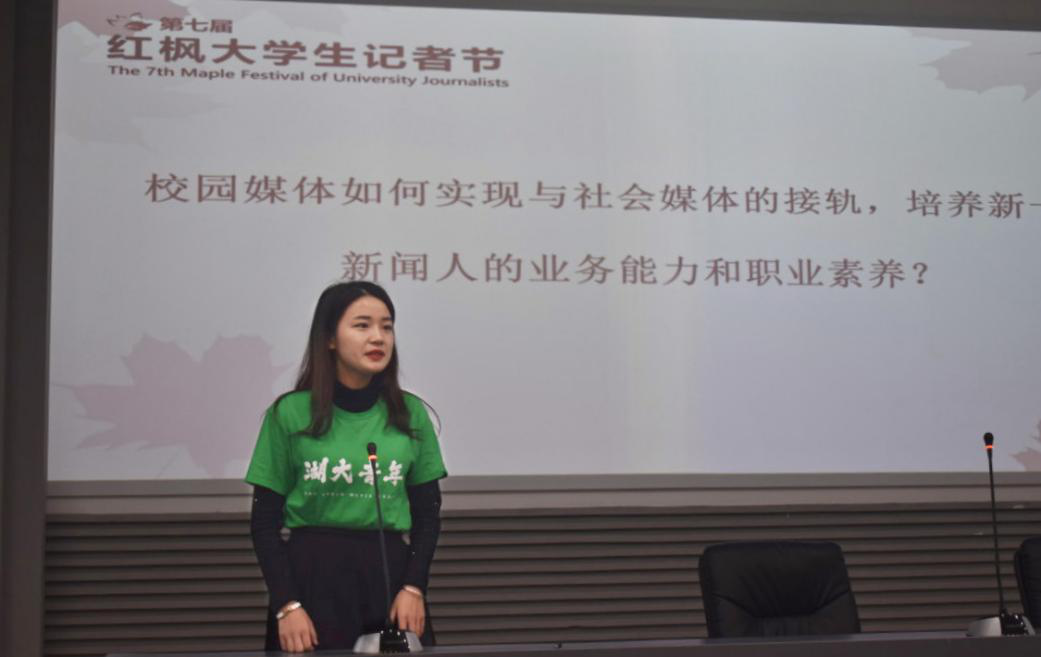 分会场讨论结束后,全体与会嘉宾人员来到主会场,对各论坛的发言观点进行了总结交流。此外,获得“第六届红枫老员工记者节扶持计划”立项的“岳麓学子论坛”、“湖大艺术有个圈”、“湖大青年传媒”负责人熊玲珑、宋爽、李子怡,还上台与大家分享了所在校媒的内容生产和管理经验总结,并提出“向更符合青年面貌,更关注社会现象,更具代表性和影响力的校园媒体发展”的未来发展目标。现场气氛热烈,掌声雷动。