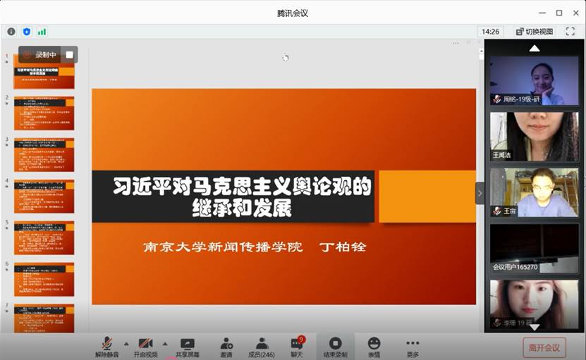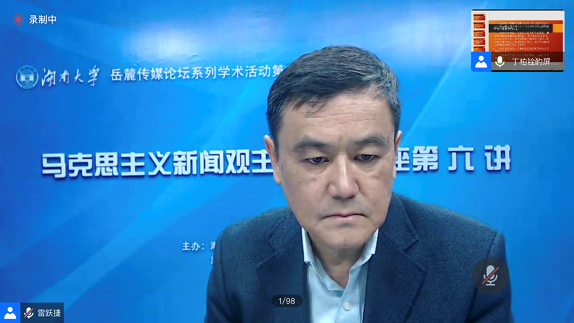 10月12日下午三点,太阳成集团tyc33455cc联合太阳成集团tyc33455cc马克思主义新闻观研究中心于“云端”腾讯会议室举办了新学期的第一场岳麓传媒论坛马克思主义新闻观主题系列讲座。此次学术讲座以“习近平总书记对中国共产党舆论观的继承和发展”为主题,由南京大学新闻传播公司教授、博士生导师丁柏铨担任主讲嘉宾,新传院特聘教授、岳麓学者雷跃捷担任主持人,校内外师生200余人参与。