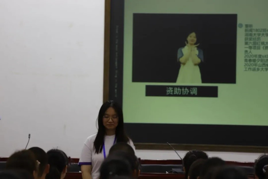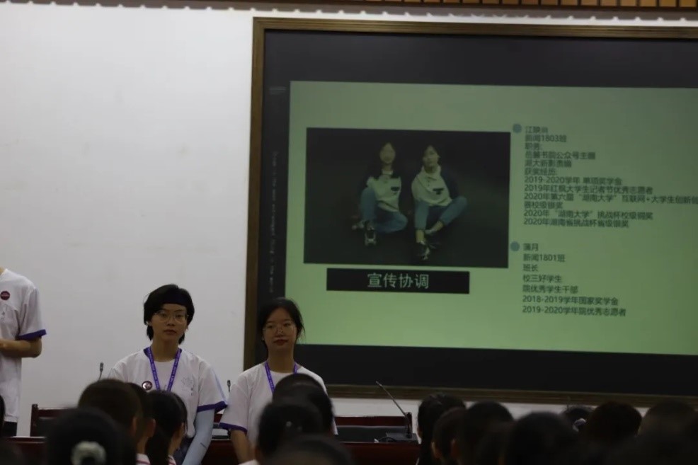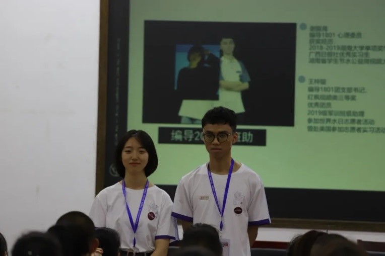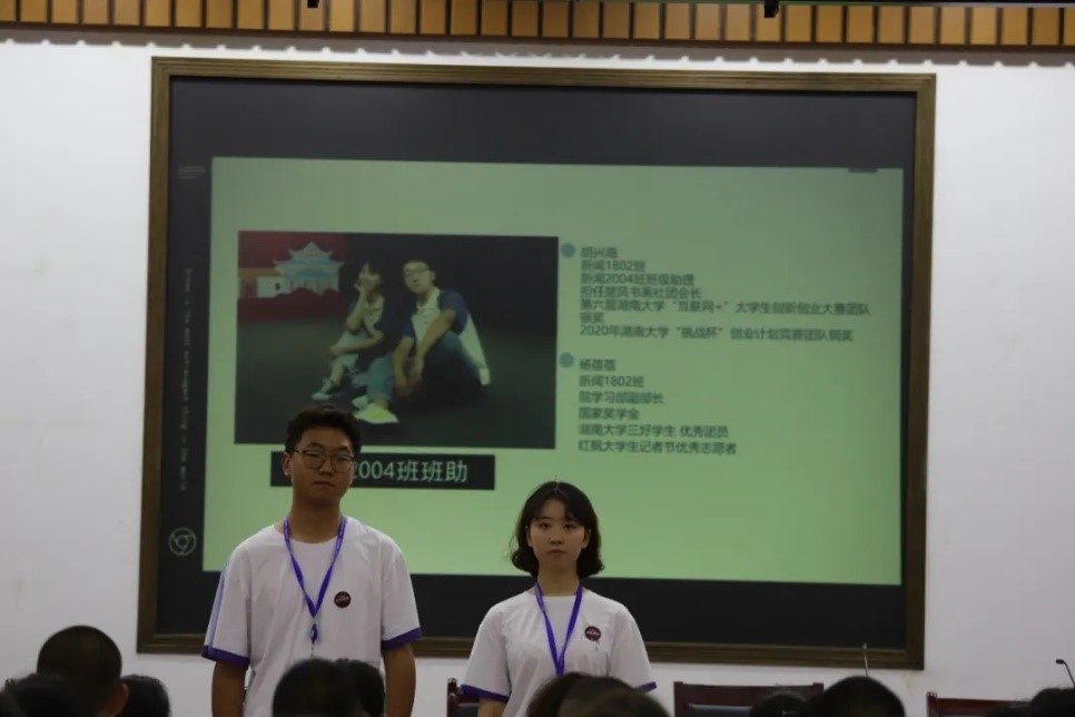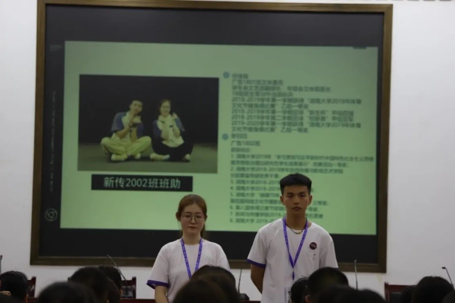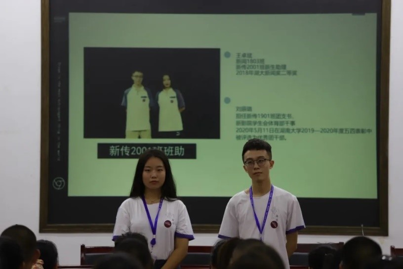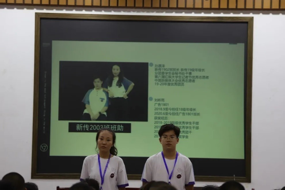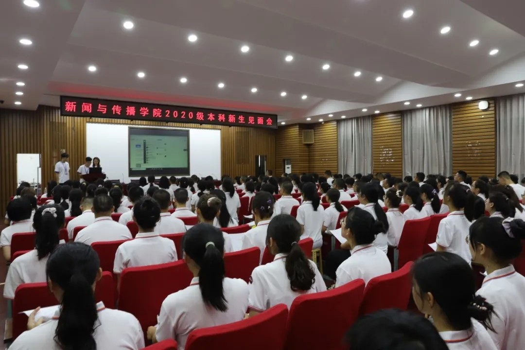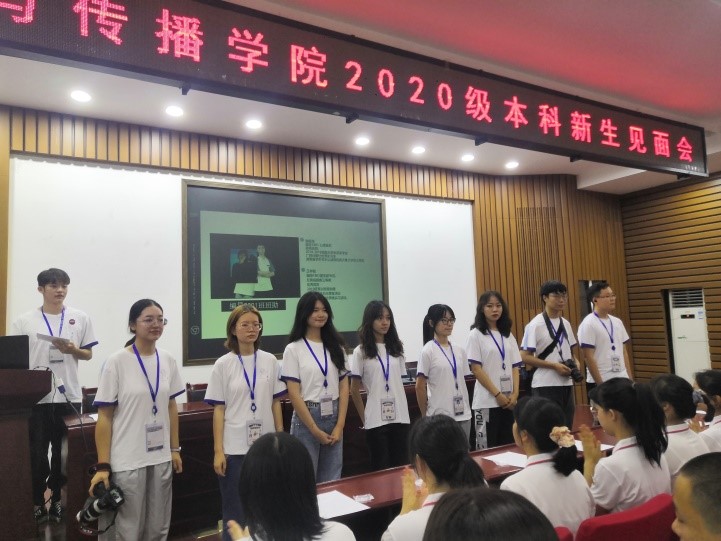 2020年9月13日下午1时,北楼217召开了2020级新生见面会。此次大会由播音班班级助理张译纹和杜志雄担任主持,新传院2020级辅导员黄坤林老师、军训团队全体成员以及新传院2020级全体新生参与会议。