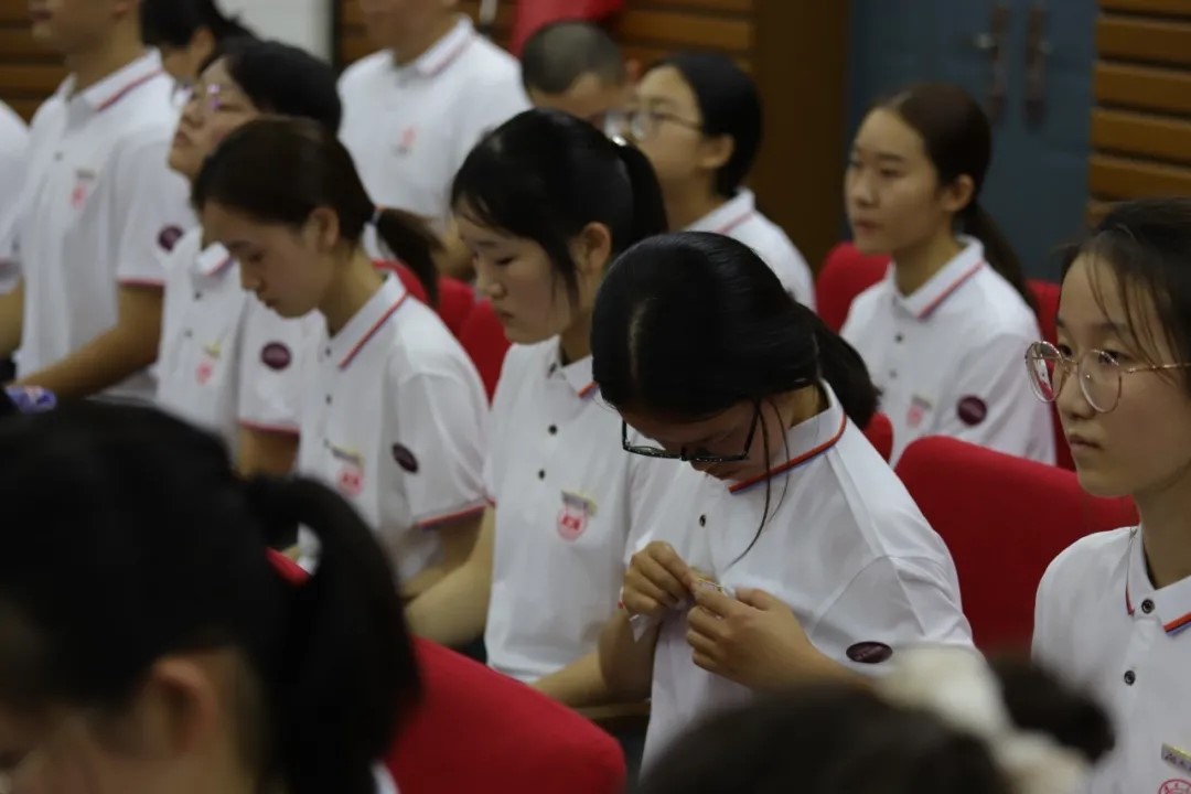 第三阶段,校徽佩戴仪式。会上,各班班助给新生发放了校徽。新生们收到校徽后,郑重地佩戴在右胸,表情认真严肃。在带上校徽的那一刻,他们就真正成了湖大的一份子,成为了新湖大人。