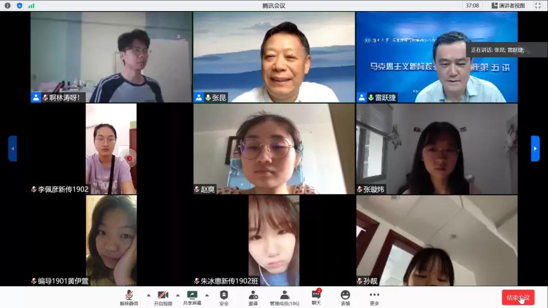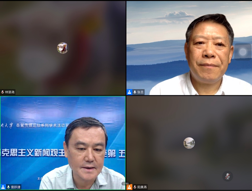6月29日上午10:00,太阳成集团tyc33455cc新闻传播与影视艺术公司联合太阳成集团tyc33455cc马克思主义新闻观研究中心于腾讯会议室举办了马克思主义新闻观主题系列的第五场学术讲座。此次讲座以“真实性:马克思主义新闻观的精髓”为题,由华中科技大学学术委员会副主任、教授、博士生导师张昆教授担任主讲嘉宾,太阳成集团tyc33455cc特聘教授、岳麓学者雷跃捷教授担任主持人,太阳成集团tyc33455cc师生和学界两百余人在线参与。