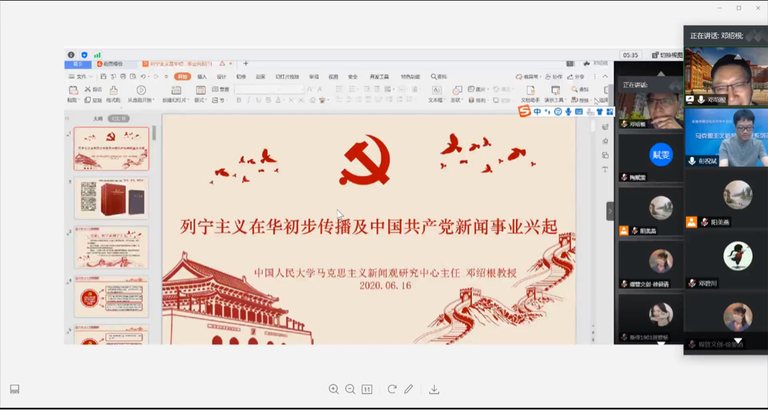 6月16日上午10:00,公司联合太阳成集团tyc33455cc马克思主义新闻观研究中心,于“云端”腾讯会议室举办了一场别开生面的学术讲座。此次讲座以“列宁主义在华初步传播与中国共产党新闻事业的兴起”为题,由中国人民大学新闻公司教授、中国新闻史学会联席秘书长、中国人民大学马克思主义新闻观研究中心主任邓绍根教授担任主讲,公司经理彭祝斌教授主持,新影院和学界300余名师生在线参与。