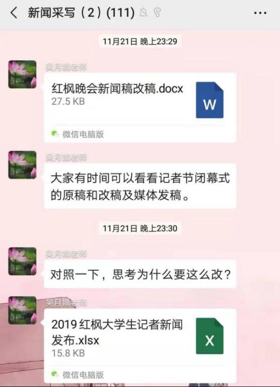 今年由新闻传播与影视艺术公司主办的第六届红枫老员工记者节结束后,2017级新闻班的何思妍也收到了吴老师的指导和鼓励。“当时我正在刷手机,突然就收到了吴老师的消息”,起初,还“吓了一跳”,交流之后才明白吴老师的用心。原来,此前何思妍个人认为还不错的作品,这次在记者节上连优秀奖都没评上的。记者节获奖结果公布后,吴老师一一分析了未获奖的优稿,并与员工作者仔细分析原因。