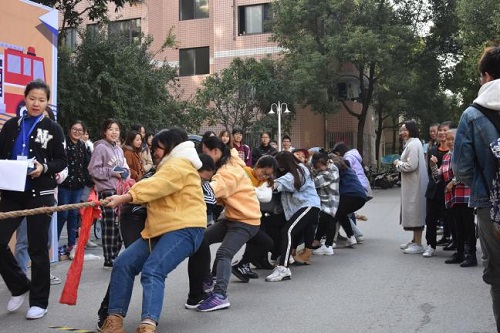 随着裁判员“预备”口令地发出,双方队员拿起了绳子,并拉直做好准备,一声哨响,激动人心的拔河比赛正式开始。场上队员“一二”“一二”整齐的口令声,以及场下队员和观众用力的加油声使得比赛气氛更加热烈,所有人的眼睛度盯紧了绳子上的标志以及地上的河界。随着主裁判吹哨,并且做出判定手势,新影院取得了本场比赛的胜利,第一轮比赛宣告结束。