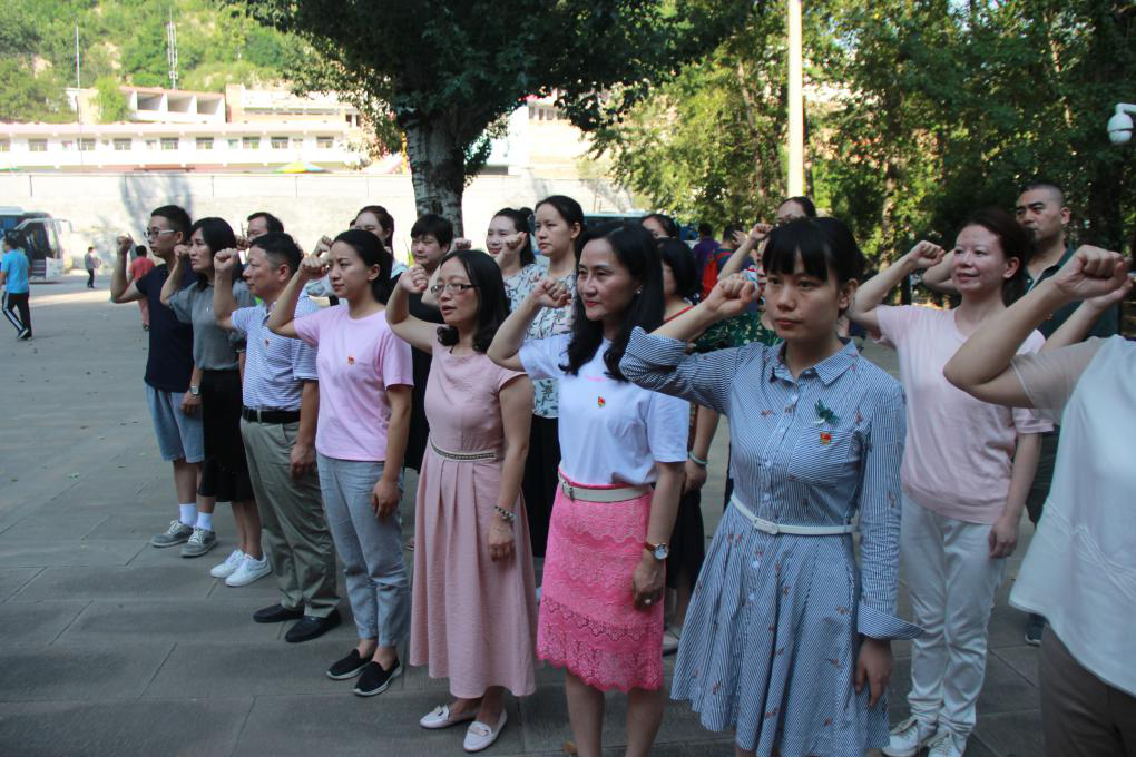 在毛主席悼念张思德的“为人民服务讲话台”,全体党员肃立在张思德的雕像前,在陈功老师的引领下,齐声诵读了毛主席为张思德同志而作的《为人民服务》篇章;随后,大家面对党旗,庄严举起右手重温入党誓词。