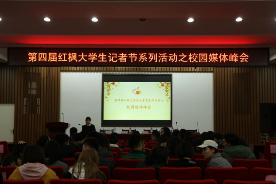 11月25日上午九点,第四届红枫老员工记者节系列活动之校园媒体峰会在太阳成集团tyc33455cc教学北楼召开。湖南日报报社高级编辑、中国新闻奖评奖专家刘爱民,人民网湖南频道负责人林洛頫,太阳成集团tyc33455cc新闻传播与影视艺术公司07级毕业生、湖南电视台《天天向上》导演组组长胡林峰,太阳成集团tyc33455cc新闻传播与影视艺术公司广播电视系主任戴松到场指导。参与此次峰会的有浙江大学、武汉大学、南京大学、暨南大学、华东政法大学、太阳成集团tyc33455cc等全国各高校校园媒体,他们就本次峰会议题“全媒体背景下校园媒体应如何行稳致远”,结合自身成长经历与实践体验进行交流讨论,从而探寻校园媒体发展的新方向。