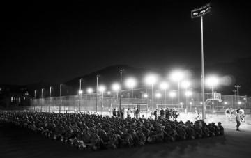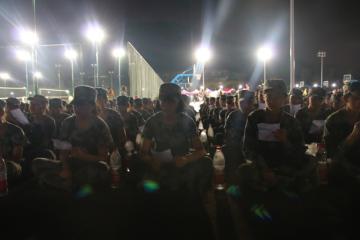 正式练歌之前,新影院员工便分成两组,进行了激烈的拉歌比赛。两帮此声未落彼声又起,不仅成为操场上独特的风景线,还用此起彼伏的吼声以及有板有眼的节奏感染着身边的每一个人。拉歌输赢全在于声音能不能压过对方,所以作为正式学习比赛军歌前的热身项目,很好的带动了操场整体的氛围。在教官协调好所有的队伍之后,新影、材料以及物电的萌新们便席地而坐,认真的跟着学长学姐学起了军歌《当那一天真的来临》。尽管人数较多,话筒声音较小,但是为了更好的听到教唱学长学姐的声音,萌新们自动围成了一个圈。认真教唱的学长学姐,认真学唱的17萌新,认真服务的各院班导,认真维持秩序的教官们,这是不为个人,不分各院,只为六营荣誉而战的项目。